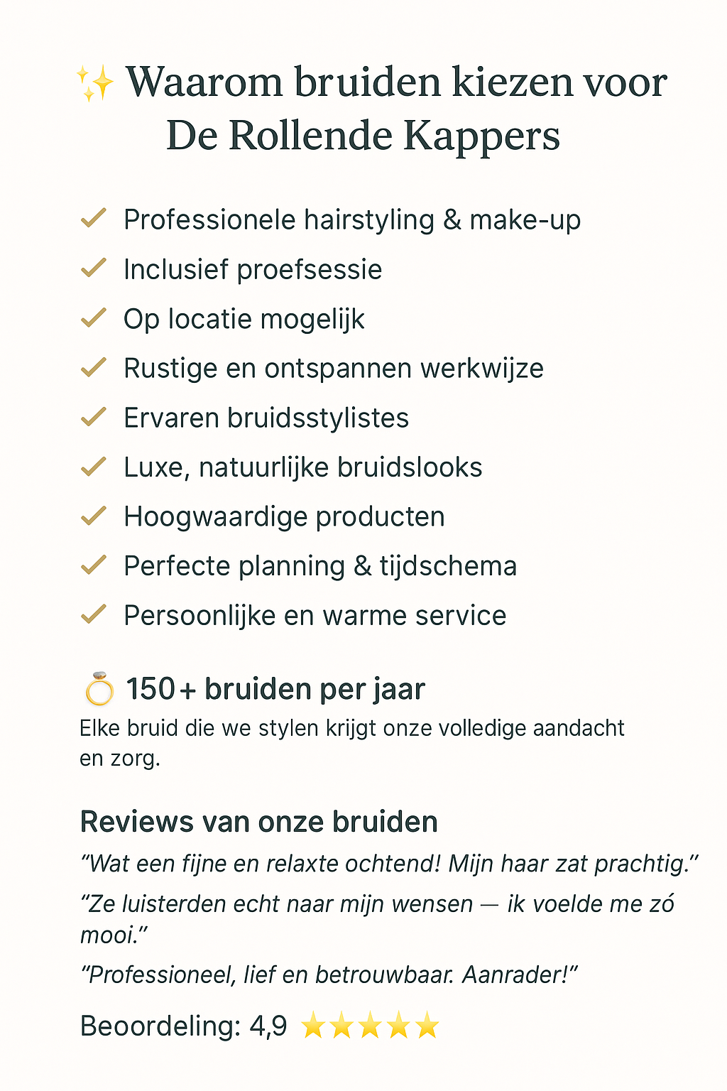 - Wil je dat je gasten ook worden gestyled? Geen probleem. We plannen het slim in, zodat iedereen mooi en op tijd klaar is.